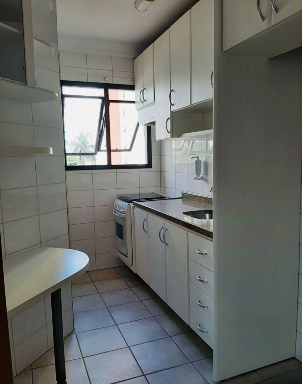 Cozinha com armários planejados, fogão embutido e mesa