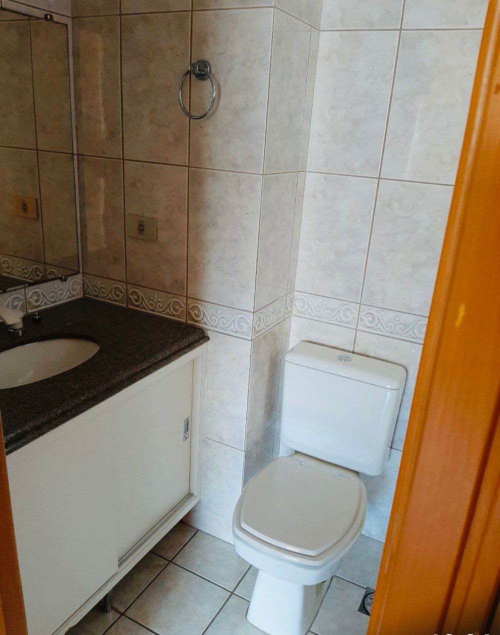 Banheiro social com armários, espelho e box blindex
